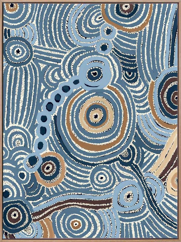 Connecting Waterways Canvas Art Print - Cool, soothing tones of indigo, dusty blue and soft cream ripple across this dynamic blue Aboriginal art print. Concentric lines, dot work and organic shapes create movement and flow, bringing the essence of water to life in this striking modern Aboriginal artwork. A stunning example of abstract Aboriginal art, it adds both visual rhythm and layered elegance to your space. Ideal for coastal, calming or minimal interiors seeking a meaningful decorative statement.
