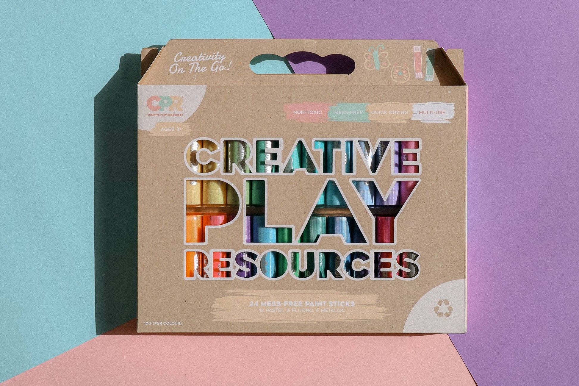 Our 24 pack of mess-free paint sticks offer a fun, safe, and creative way for kids to express themselves. Featuring 12 pastel, 6 fluoro, and 6 metallic colours, these twistable, non-toxic paint sticks are perfect for young artists. Their quick-drying formula ensures no mess, while they work on a variety of surfaces. Compact and portable, this set is perfect for on-the-go creative fun and makes an ideal gift for kids 3+. Let your child's imagination run wild with these vibrant, mess-free and stylish artistic tools! Designed with care in Australia, meets Australian toy safety standards.